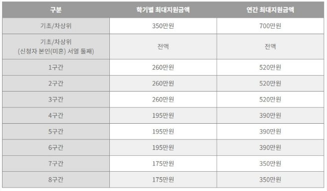 소득분위 6단계의 경우 450,000원으로 지원을 받게 되고, 7단계는 400,000원으로 내려갑니다. 그러니 소득이 조금씩 오르더라도 학비 부담이 낮아지지 않는 것을 알 수 있어요. 최선을 다해 학업에 매진할 수 있도록 해야죠~^^